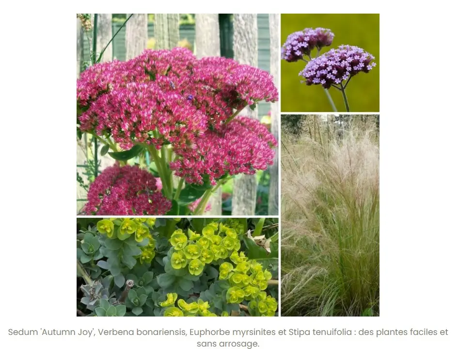 Enfin, les plantes couvre-sol sont idéales pour minimiser l'entretien de votre jardin autonome. Elles étouffent les mauvaises herbes et maintiennent l'humidité du sol. Optez pour des variétés comme le lierre, le lamier ou le géranium vivace. Rustiques et faciles à vivre, bon nombre de plantes vivaces sont même adaptées aux jardins sans arrosage. Euphorbes, sauges, achillées, stipas, sedum, armoise, verveine de Buenos Aires pour ne citer qu’elles sont de vrais chameaux et supportent les étés les plus secs tout en offrant souvent une jolie floraison.