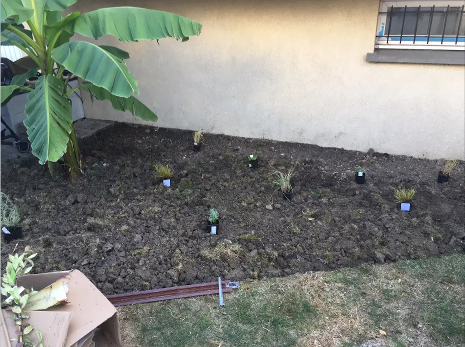 L'objectif défini était ainsi de remettre en état le gazon en effectuant un réengazonnement sur 20 m2 environ. Pour cela, une scarification et un regarnissage sur la surface ont été faits. Un espace partiellement situé sous un balcon était couvert de dalles gravillonnées. Seul un bananier était présent. Nous avons proposé de faire un petit massif de 20 m2 environ pour y planter des petites graminées très persistantes et transplanter d'autres végétaux déjà présents.
