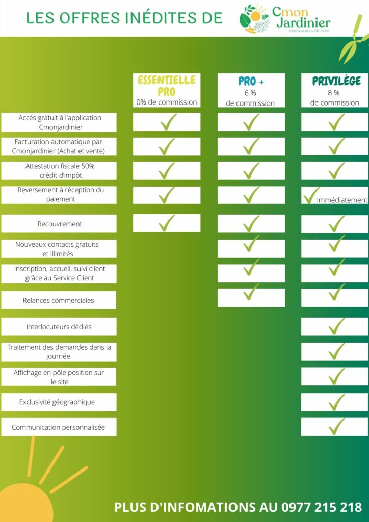L’offre « Pro+ » correspond à notre offre actuellement utilisée par déjà plus de 300 jardiniers paysagistes. En plus des services de l’offre « Essentiel Pro » vous bénéficiez de nouveaux contacts gratuits et réguliers, de l’assistance quotidienne de notre service client qui devient votre secrétariat commercial, vos devis sont relancés, vos encaissements sont gérés.