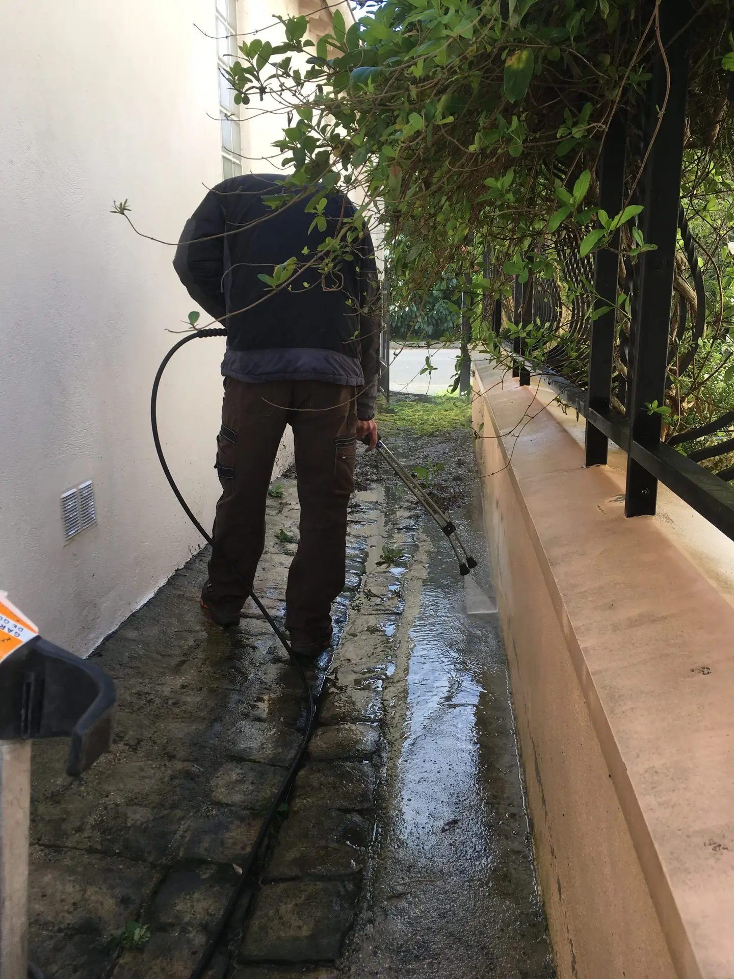Cette intervention consistait à tailler un arbre, une haie et nettoyer des pavés grâce à un système haute tension.